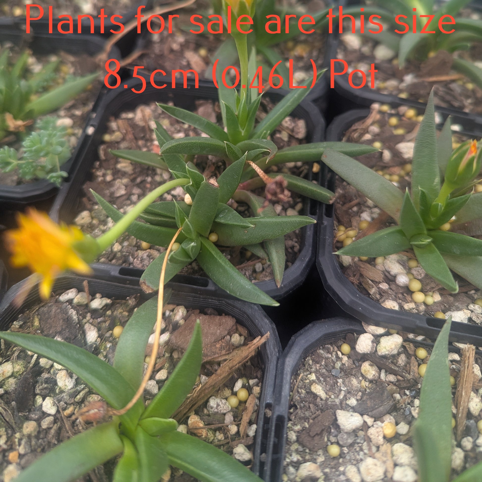 Bergeranthus multiceps is a small succulent that forms a tightly packed clump of suberect, tapering leaves. It can grow up to 3.2 inches (8 cm) tall and develop a single fleshy rootstock that expands as it ages. The rootstock can reach a diameter of 1.6 inches (4 cm). The leaves are fleshy, green, and triangular in cross-section.