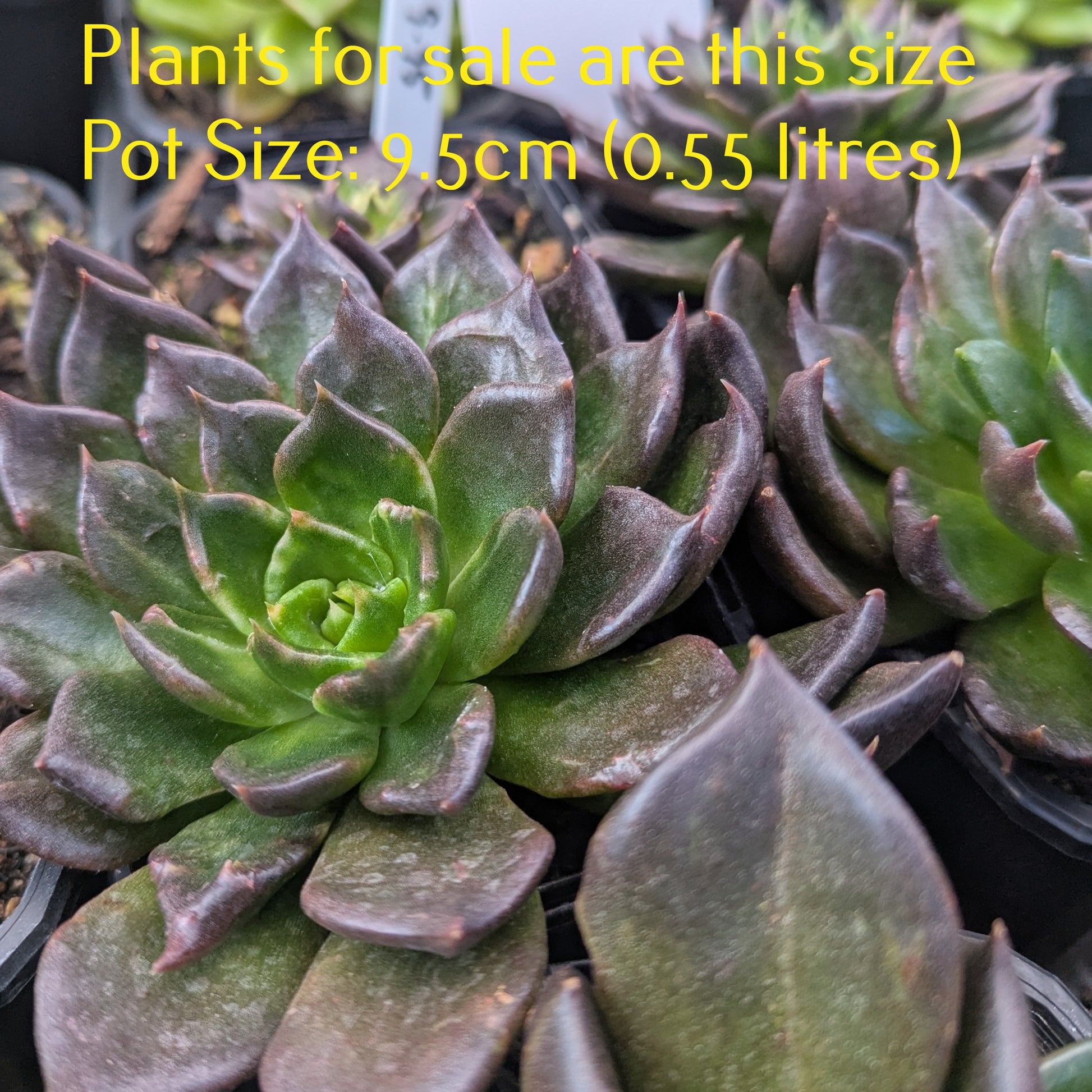This beautiful echeveria has gorgeous dark green, purplish and almost black leaves. Upon closer inspection, you will catch a tinge of yellowish green in the center of the rosette which spreads outward to the tips of the leaves.