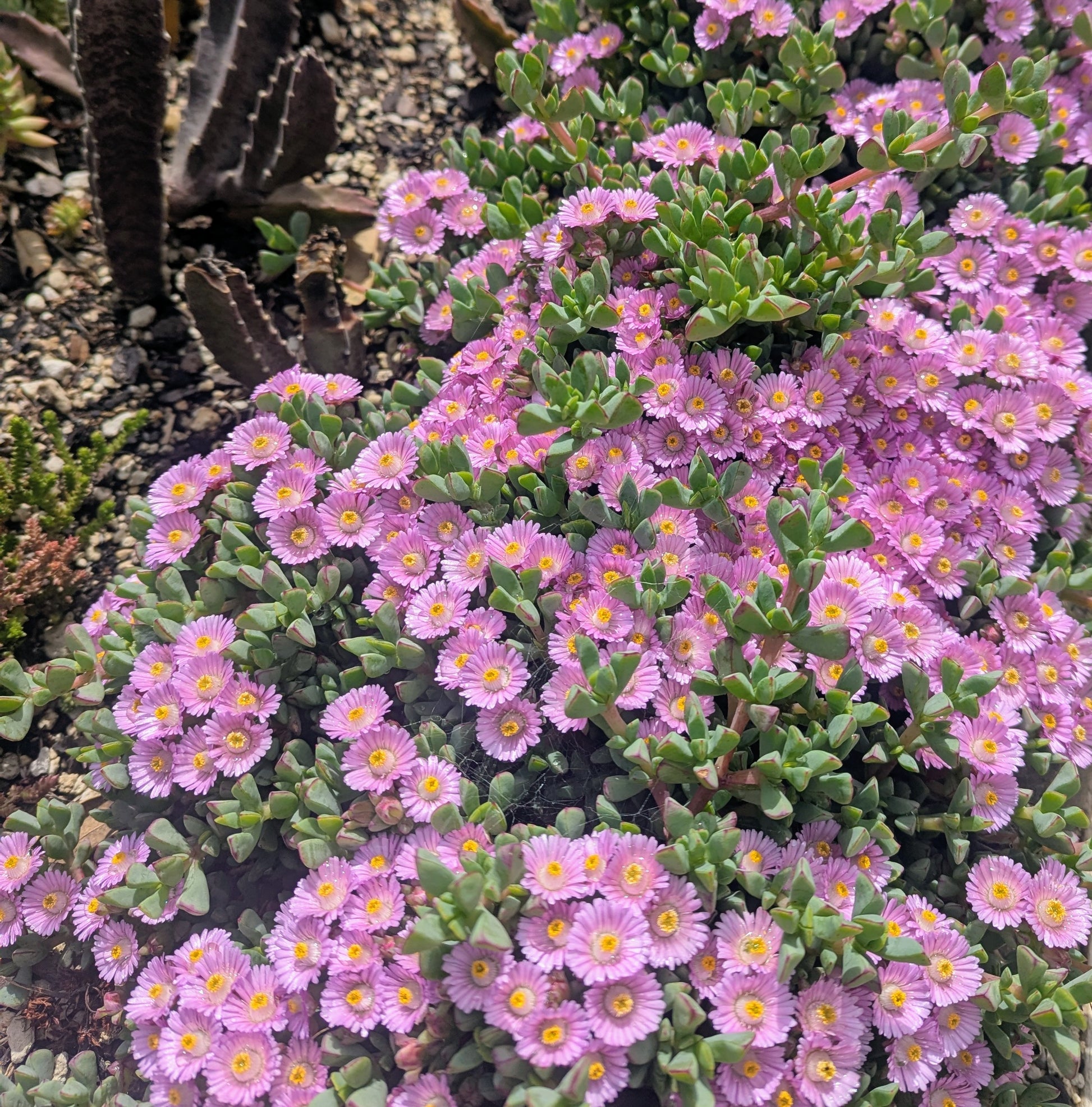 The almond-scented flowers, which range from lavender-pink to purple with a yellow center, appear in spring and summer and can reach up to 0.8 inches (2 cm) in diameter. They are closed in the morning but open in the afternoon, often covering the plant.