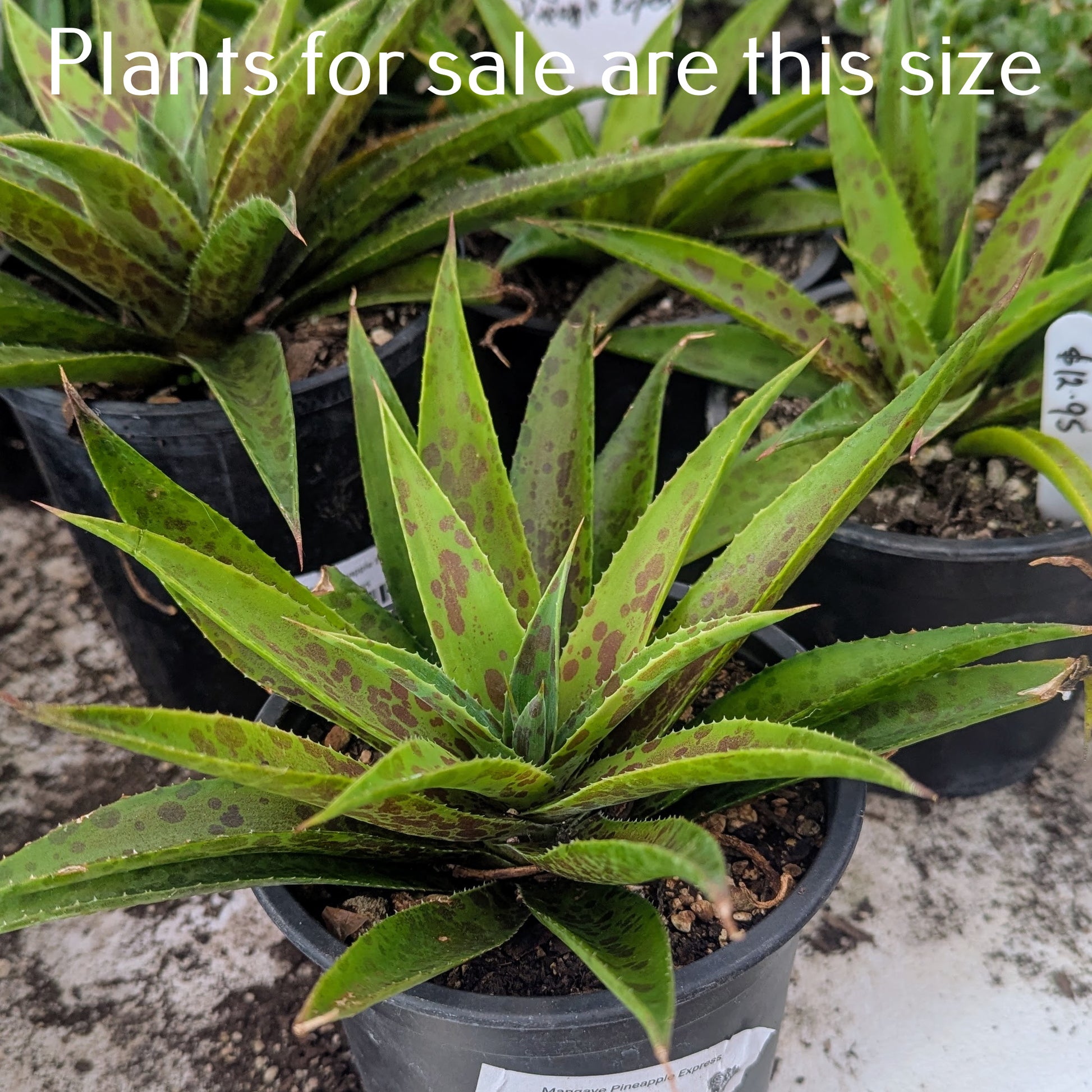 The refined, spiky habit of this Mangave will remind you of the top of a pineapple. 1” wide, dark green leaves are long and slender, with pronounced burgundy spotting. The spots will be more pronounced when in full sun and exposed to UV light. A waxy coating gives the leaves a minty-green finish. Leaves are packed in tightly to form a spiky rosette. Tiny spines line the margins, and a very sharp, cinnamon terminal spine complete the spiky look. Plant this Mangave in a yellow or tan container to complete the pineapple look!